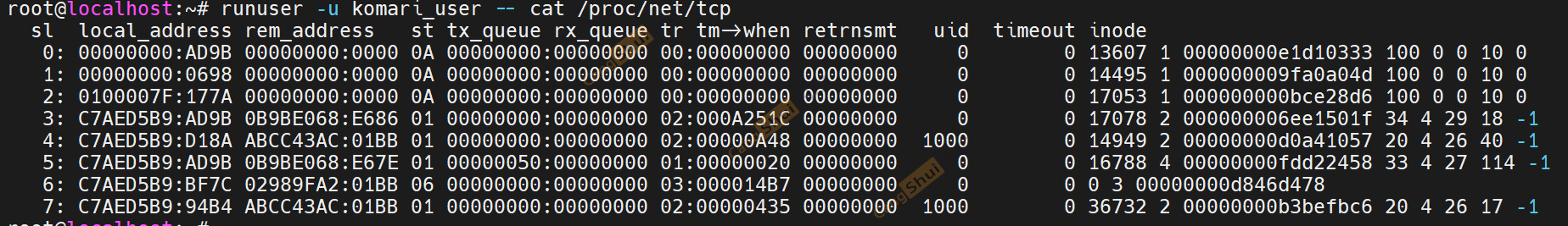 runuser -u komari_user -- cat /proc/net/tcp